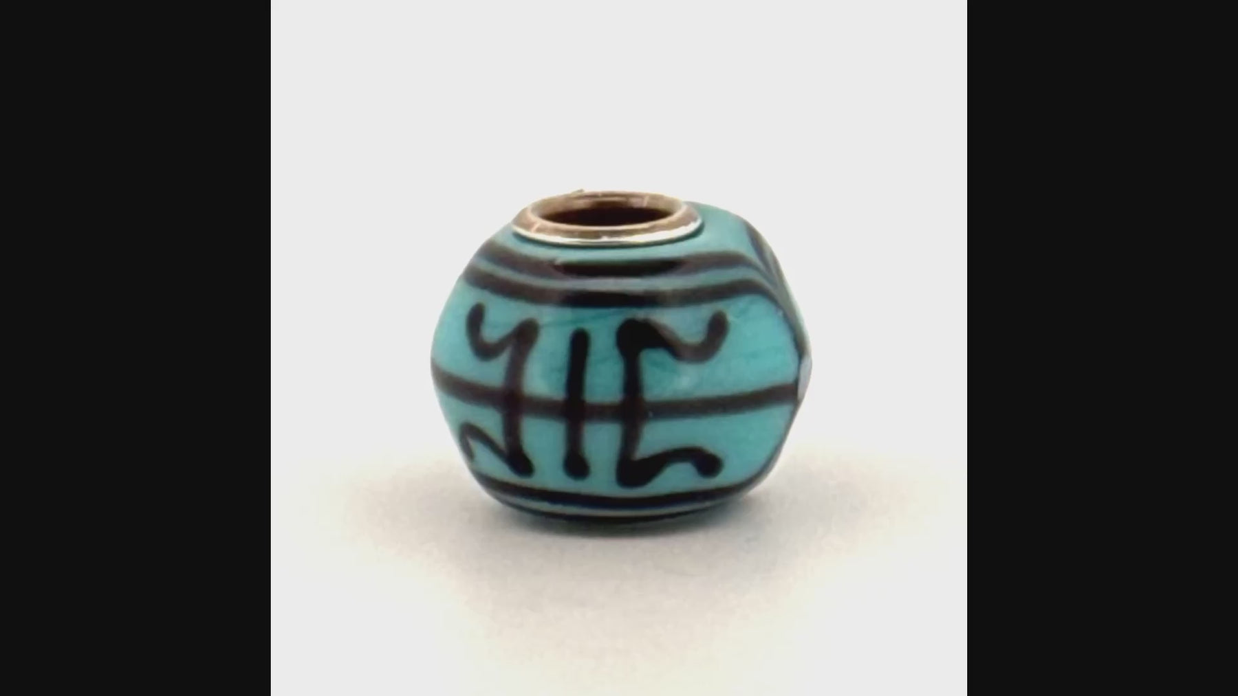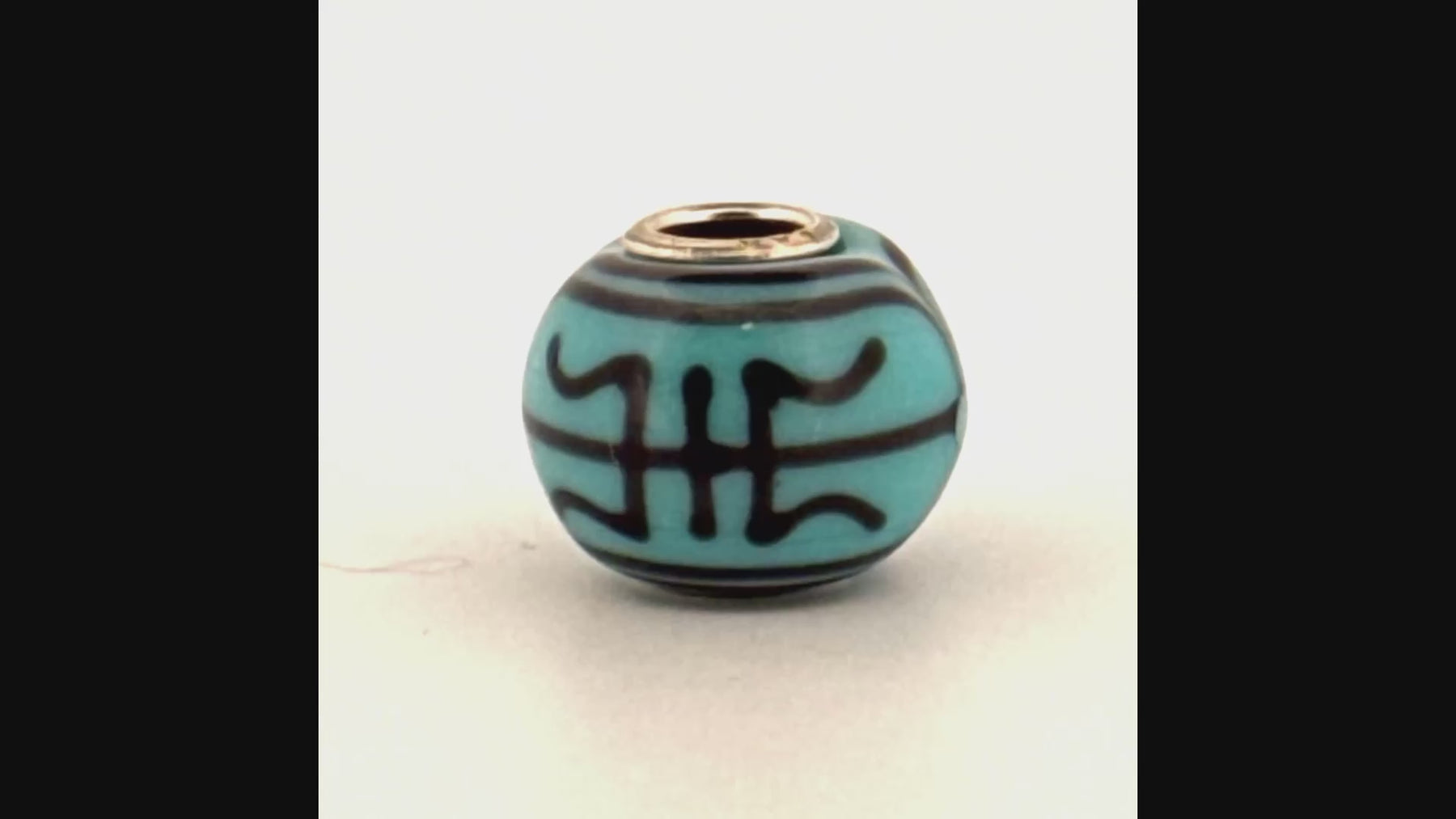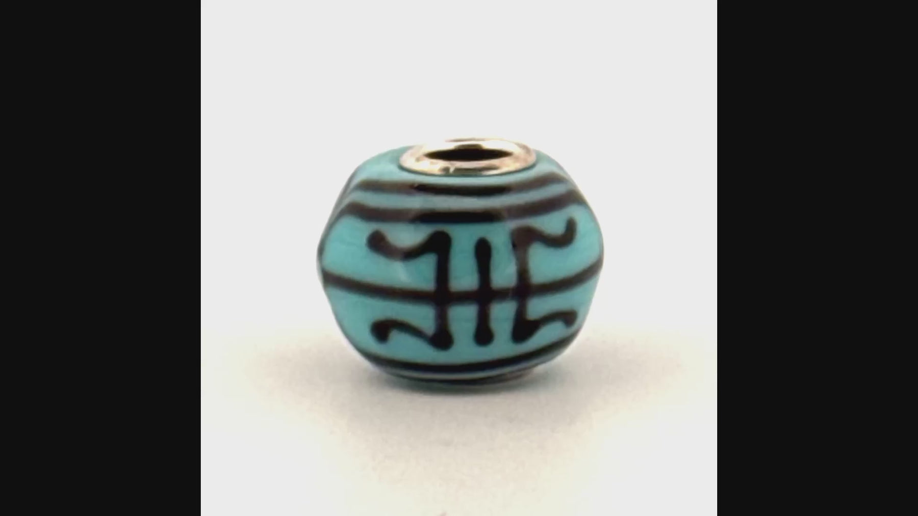 Limited edition, handcrafted glass with longevity symbol. A rich turquoise background with deep indigo lines encircling the bead in a timeless pattern of strength and endurance. For Life represents lasting bonds and the quiet power of support that never fades.