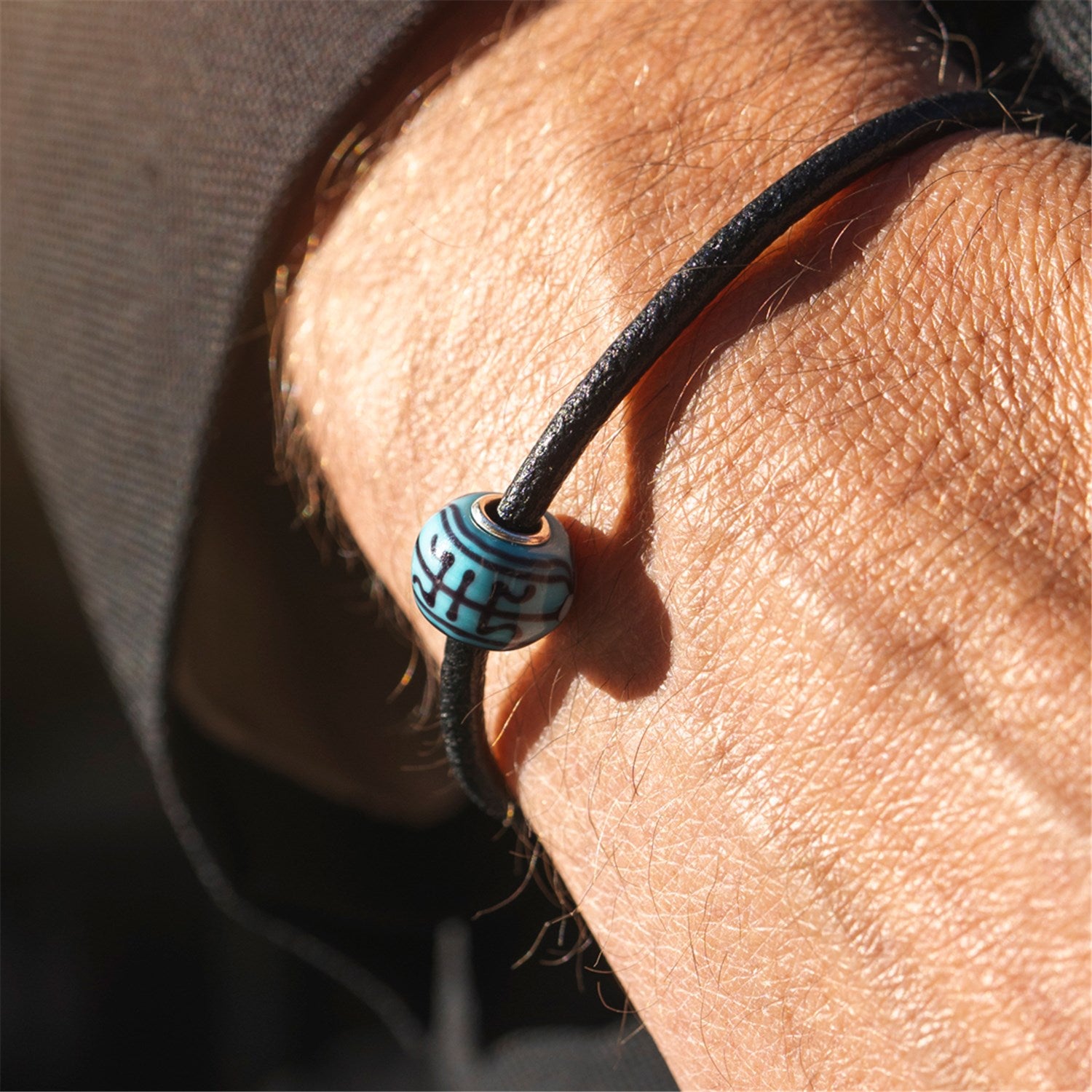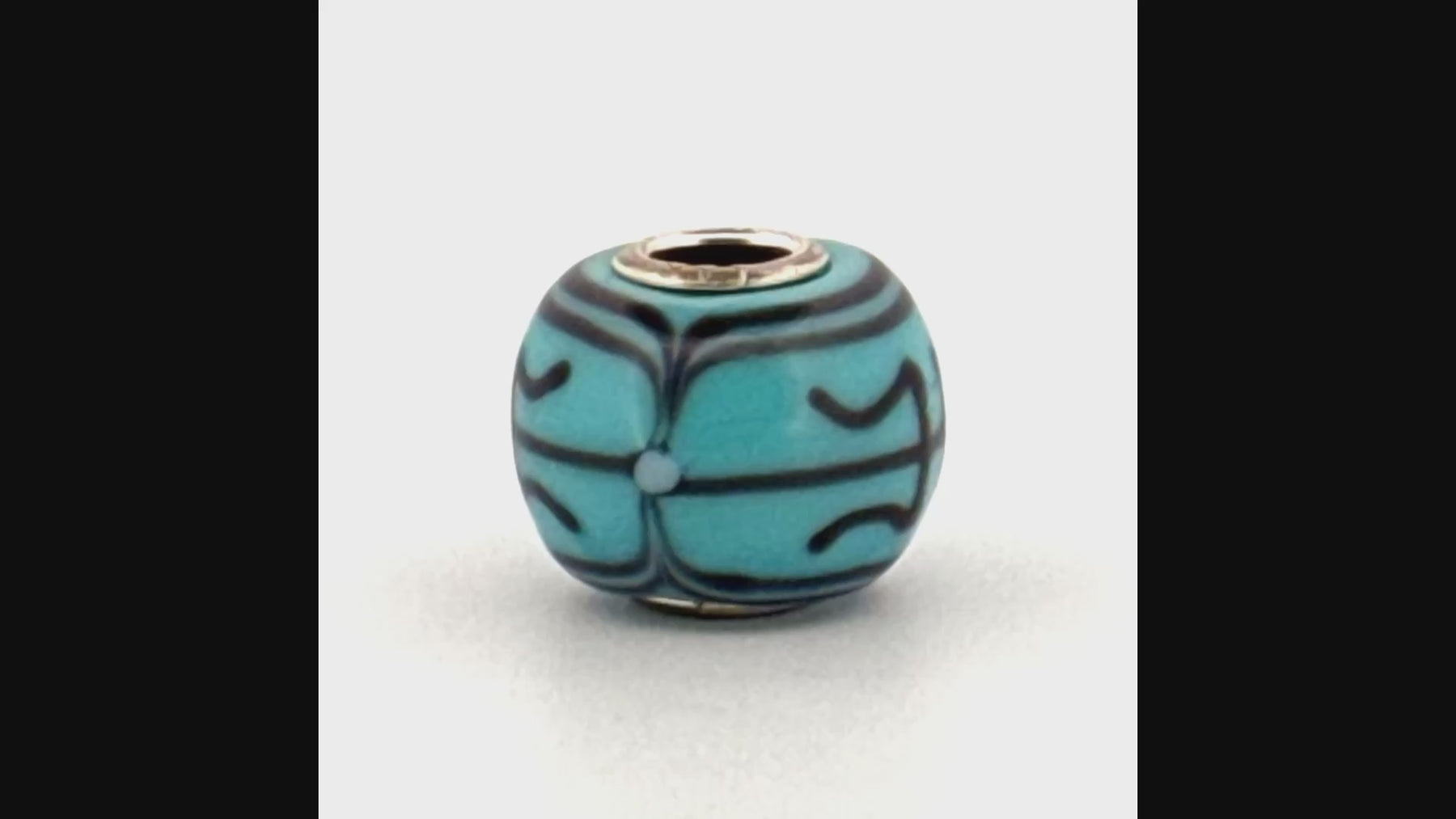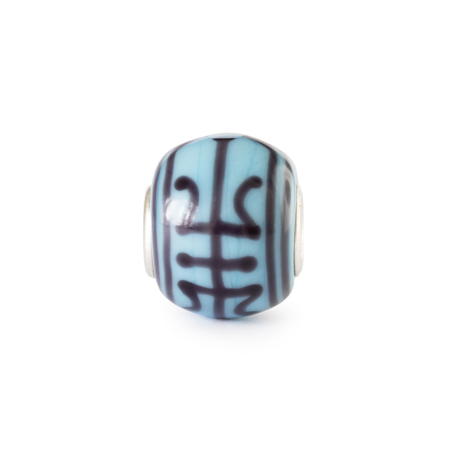 Limited edition, handcrafted glass with longevity symbol. A rich turquoise background with deep indigo lines encircling the bead in a timeless pattern of strength and endurance. For Life represents lasting bonds and the quiet power of support that never fades.